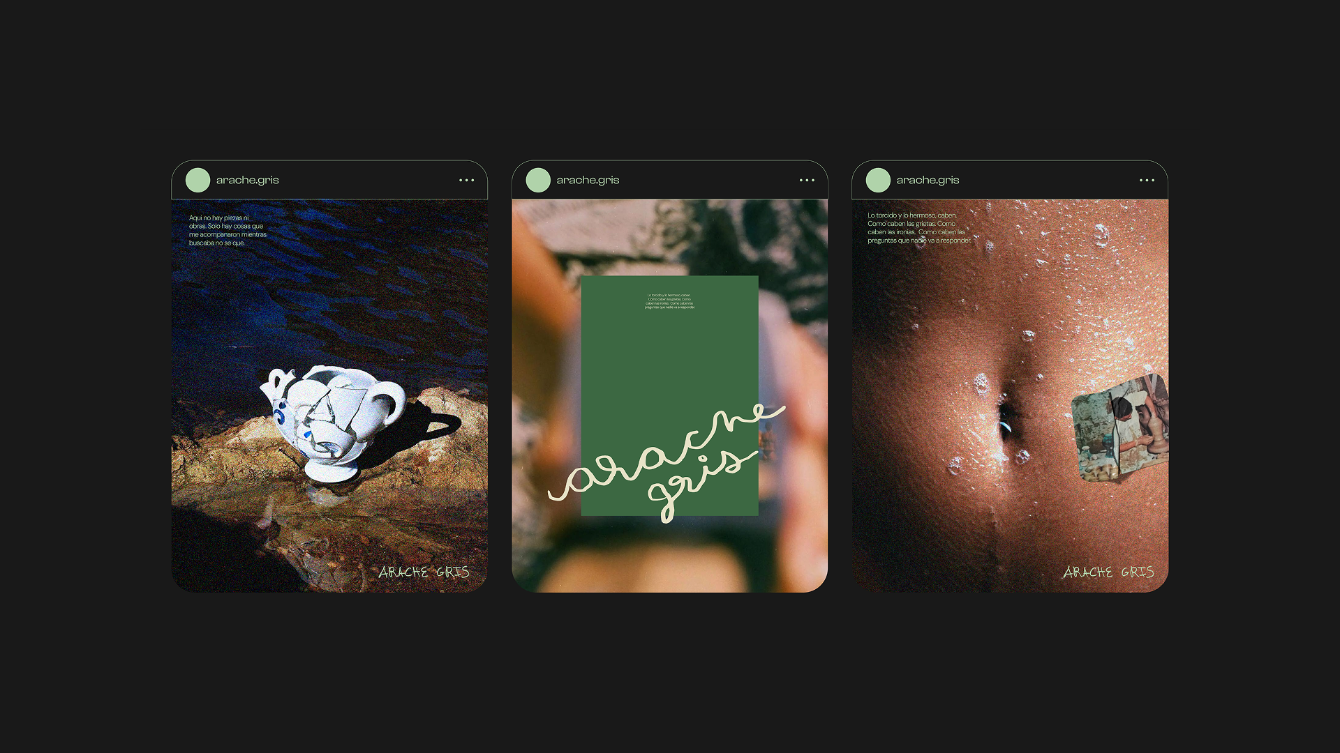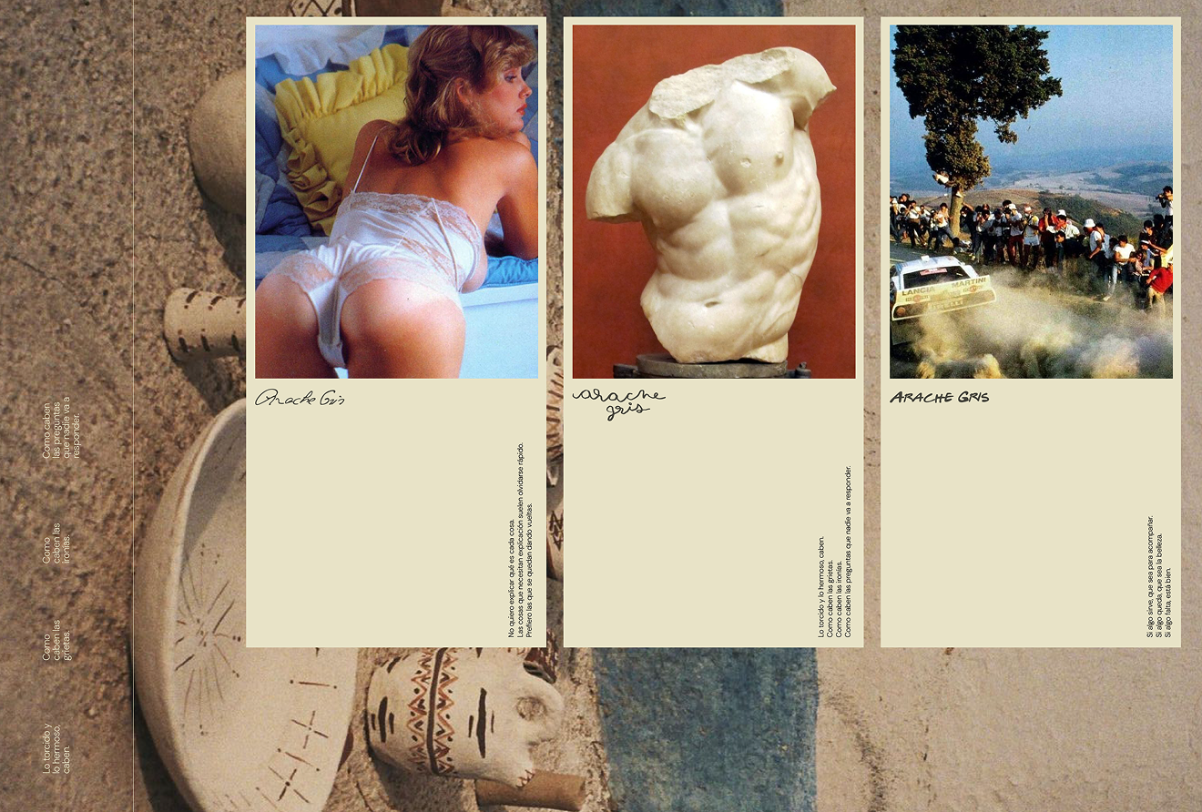 Desde lo conceptual, el universo de Arache Gris se sostiene en la intimidad, el misterio y la contradicción. No todo se explica. No todo se nombra. La belleza aparece en lo torcido, lo cotidiano, lo aparentemente inútil. No persigue la perfección ni la utilidad; celebra el error y la ironía como formas de verdad.